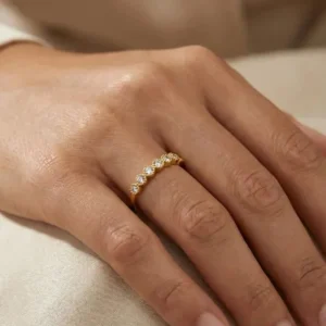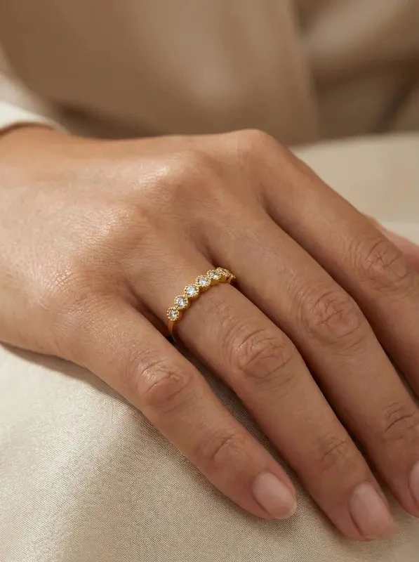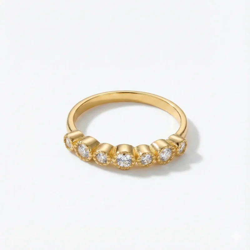 Lo que realmente distingue a este anillo son sus 7 circonitas cuidadosamente seleccionadas y colocadas. Estas piedras finamente talladas aportan un brillo espectacular que eleva tu estilo personal. Su diseño logra un equilibrio perfecto entre discreción y sofisticación, añadiendo ese toque de lujo que buscas para complementar tus looks diarios.