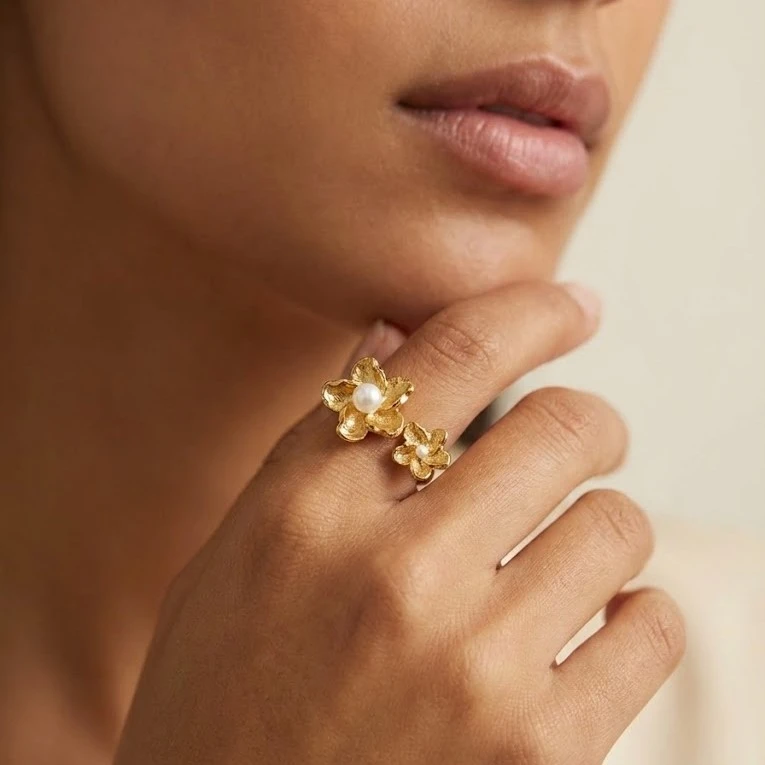 Este precioso anillo destaca por su diseño caprichoso y refinado. Incorporando dos flores de acabado perfecto, cada una con una perla en su centro, consigue transmitir frescura y elegancia en un solo accesorio. Su concepto de dos flores aporta un aire juvenil, mientras que las perlas en el centro evocan atemporalidad y sofisticación. Es un diseño versátil que se adapta tanto a eventos casuales como formales.
