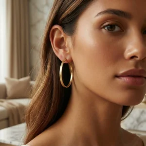 Con su tamaño medio y su forma plana, estos aros son lo suficientemente discretos para llevarlos cómodamente durante el día, pero lo suficientemente elegantes para realzar tu look en eventos especiales. Su diseño clásico y atemporal se adapta a una amplia variedad de estilos y colores, convirtiéndolos en el aliado perfecto para cualquier guardarropa. Ya sea en la oficina, una salida informal o una cena especial, estos aros elevarán tu estilo de manera sutil pero efectiva.