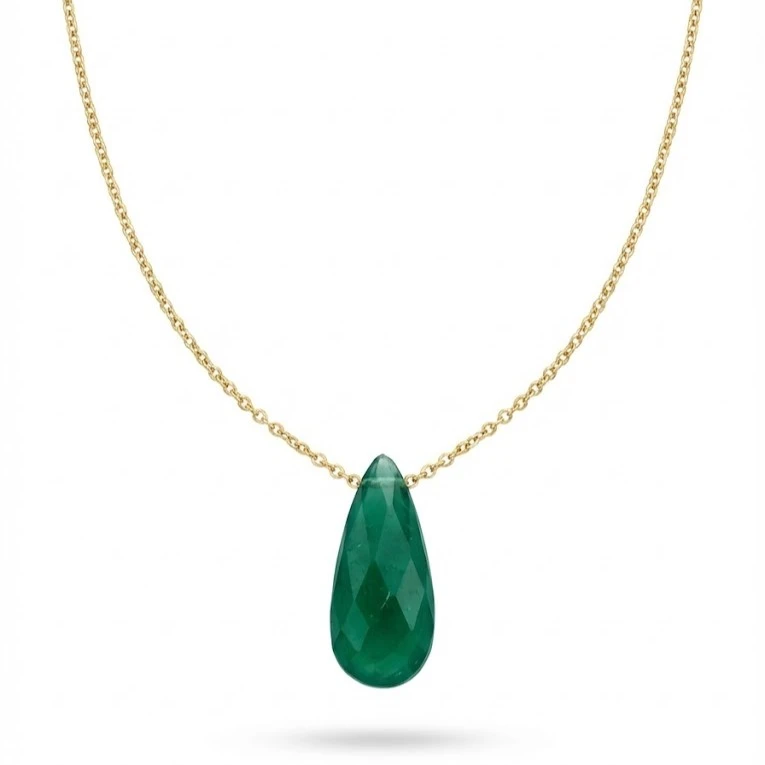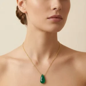 El protagonismo de esta gargantilla radica en su fina piedra natural en forma de gota, con un vibrante tono verde que aporta frescura y color. Este detalle único eleva el diseño, convirtiéndolo en un accesorio versátil, ideal tanto para lucir en eventos especiales como en el uso cotidiano.
