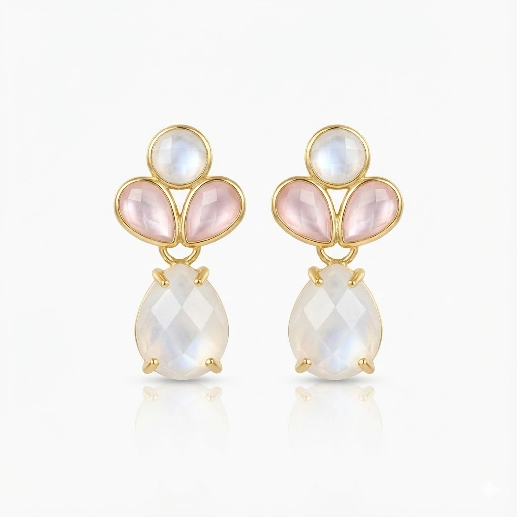 La combinación de cuarzo rosa y plata bañada en oro de 24K no solo aporta una estética refinada, sino también durabilidad y exclusividad. Cada piedra ha sido biselada para maximizar su brillo y mostrar toda su belleza natural. El montaje con plata italiana garantiza que el pendiente no solo sea elegante, sino también resistente para el uso diario, sin perder su calidad con el tiempo.