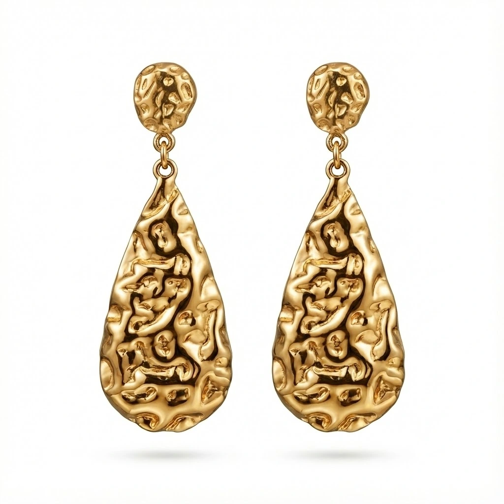 Fabricado con acero inoxidable 316L de alta calidad y un baño de oro de 18 quilates, este pendiente está diseñado para proporcionar resistencia al desgaste y mantener su brillo durante mucho tiempo. La atención a los detalles en su textura labrada le agrega un encanto especial, asegurando que cada pieza sea una auténtica declaración de estilo.