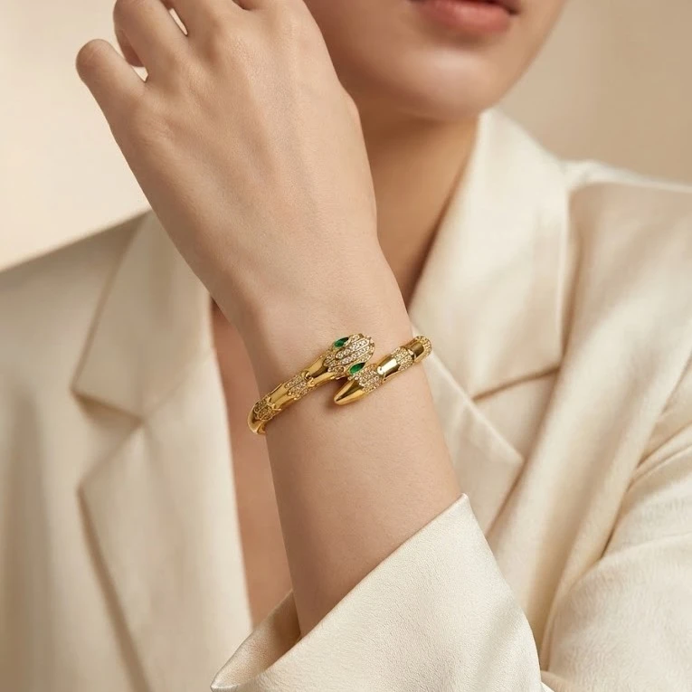 Fabricada con acero inoxidable 316L de grado premium y recubierta con un baño de oro de 18K, esta pulsera asegura resistencia al desgaste y una apariencia vibrante por años. Además, cuenta con brillantes blancos meticulosamente incrustados en su estructura y dos brillantes verdes que destacan como los ojos de la serpiente, añadiendo un toque hipnótico que te hará deslumbrar.