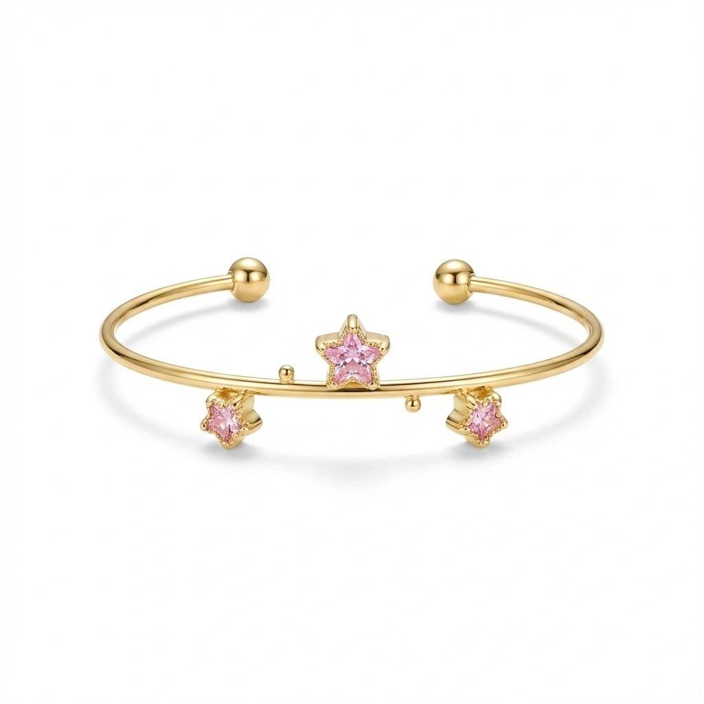 Realzada con tres estrellas de cristal rosa engastadas en oro, esta pulsera es mucho más que un accesorio: es una obra de arte. Los cristales aportan un destello sutil que eleva cualquier atuendo, proporcionando un toque de color refinado que encantará a mujeres de todas las edades. Ya sea como un regalo especial o como un complemento para uso diario, estas estrellas de cristal agregan una dosis de glamour y encanto único.