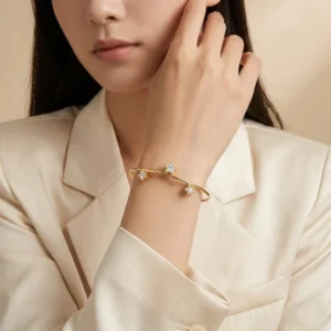 Lo que realmente hace de esta pulsera un accesorio único son sus tres estrellas de cristal transparente engastadas en oro. Cada estrella ha sido cuidadosamente diseñada y posicionada para crear un delicado equilibrio entre lujo y sencillez. Estos cristales no solo añaden brillo y personalidad, sino que también realzan la exquisitez del baño en oro de 18K, aportando un toque irresistible de sofisticación.