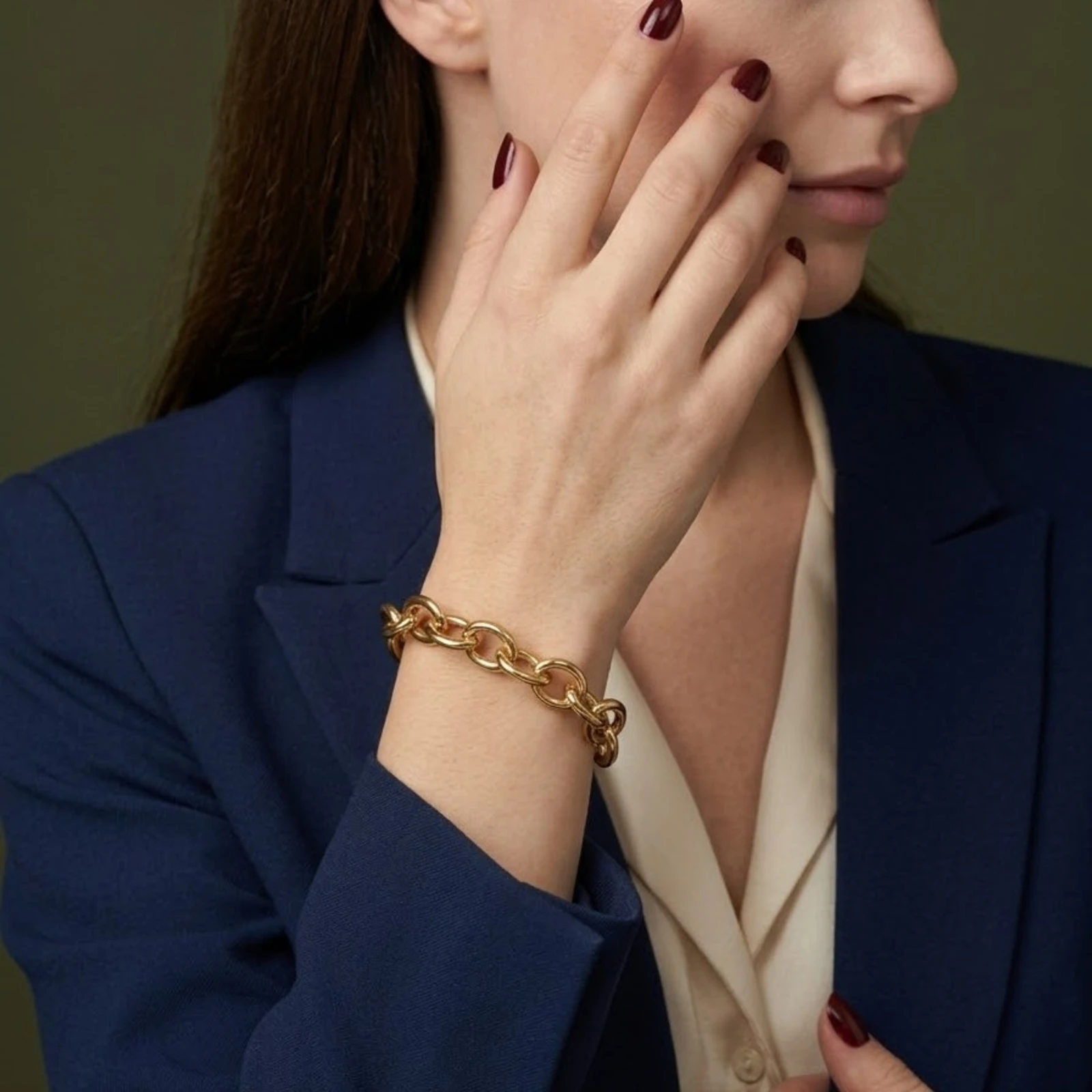 Transforma tu look con nuestra pulsera de acero inoxidable 316L bañada en oro de 18k. Diseñada para destacar, cada eslabón es una obra de arte que añade un toque de volumen sofisticado y elegancia inmortal. Con esta pulsera, el lujo nunca fue tan accesible y permanente.
